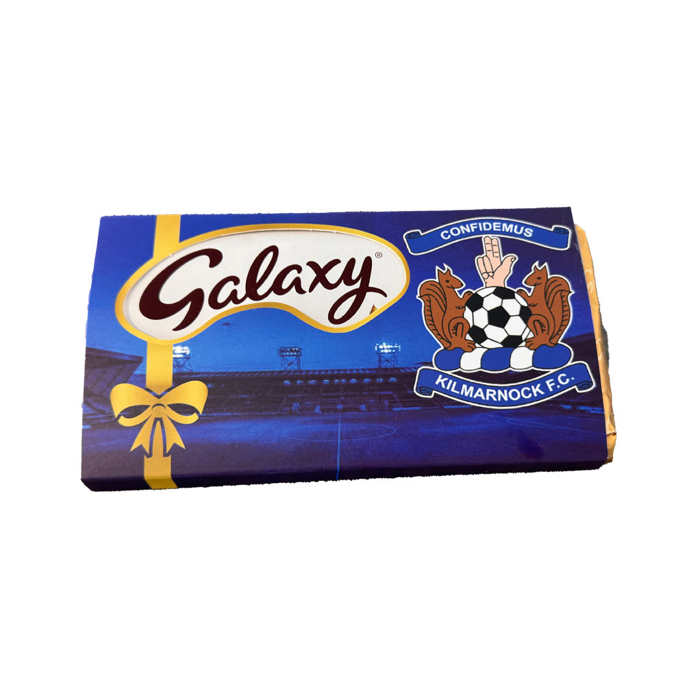 The Kilmarnock FC Galaxy 100g Chocolate Bar, with space for a personalised message on the rear for gifting.