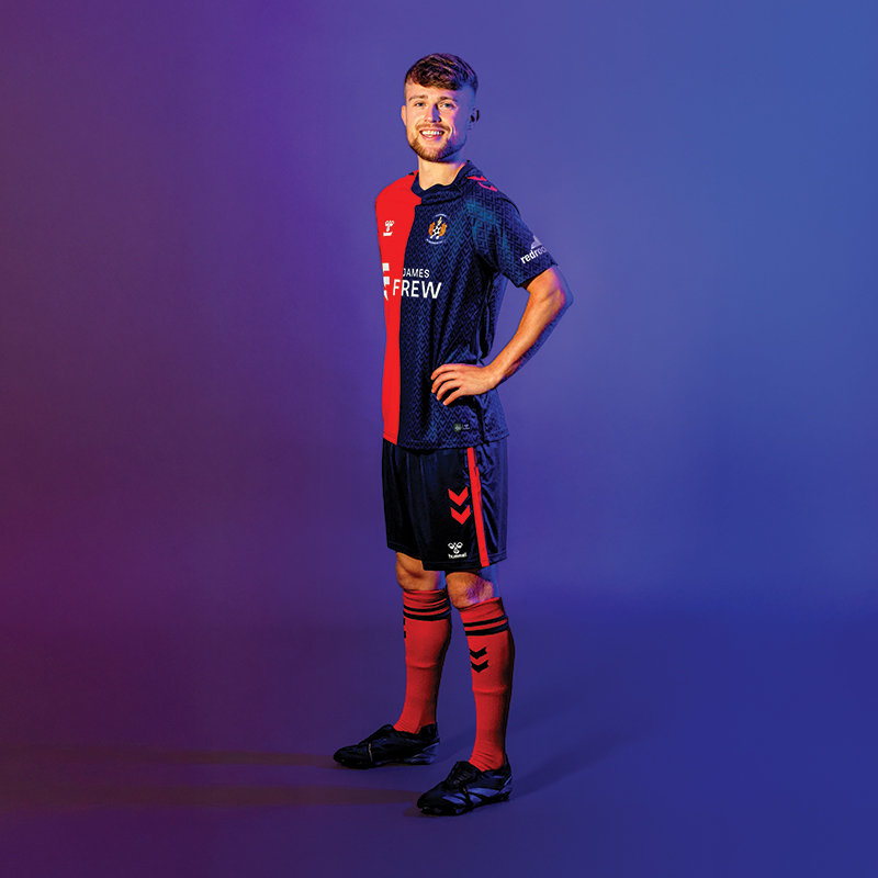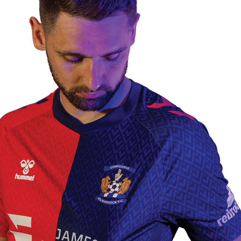 Featuring a modernised half-and-half red and navy design, the shirt subtly weaves in a tonal pattern inspired by the original kit — now updated to incorporate Hummel’s iconic chevrons. Blending nostalgia with cutting-edge performance, this shirt celebrates a global chapter in Killie’s story with unmistakable pride.